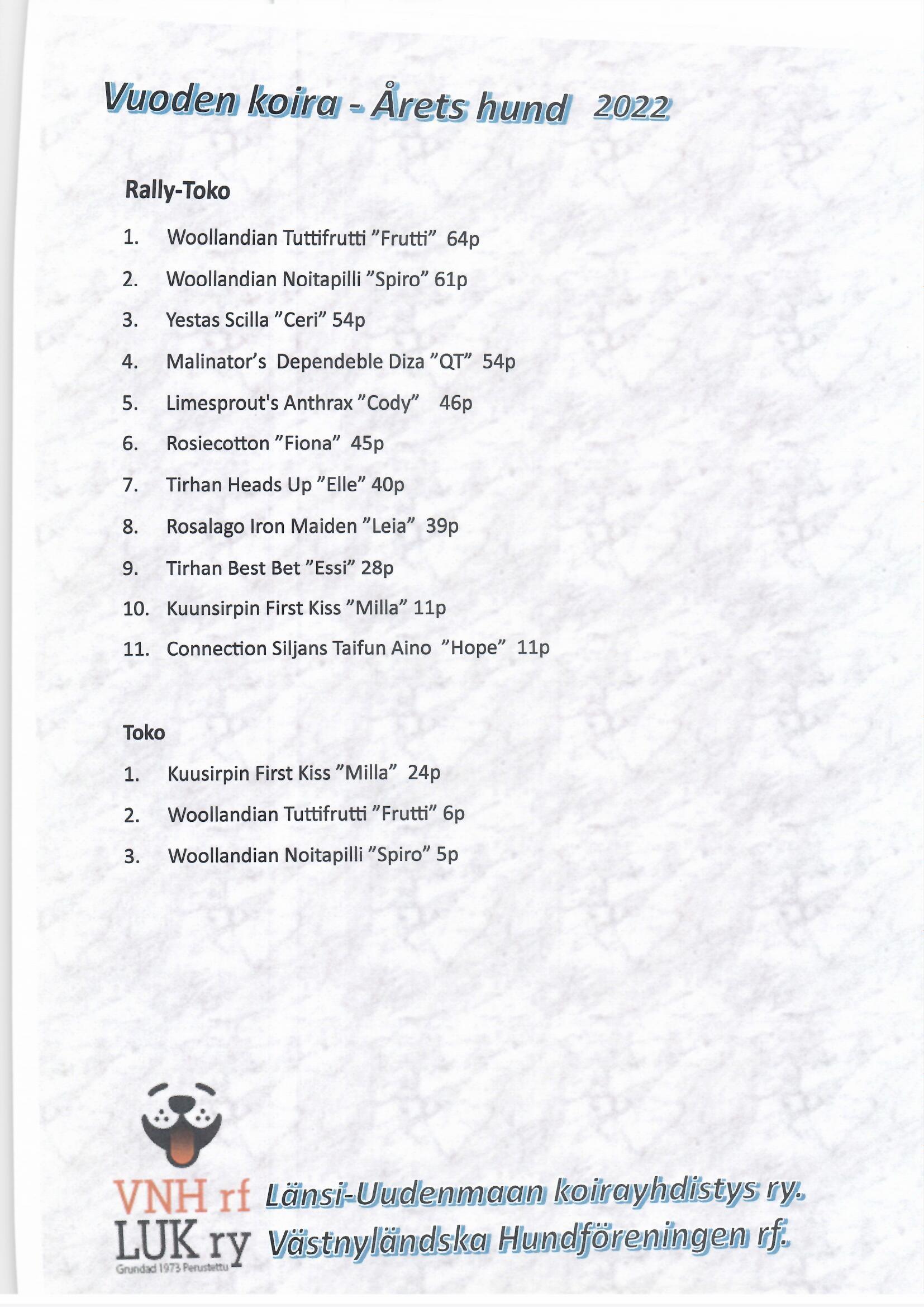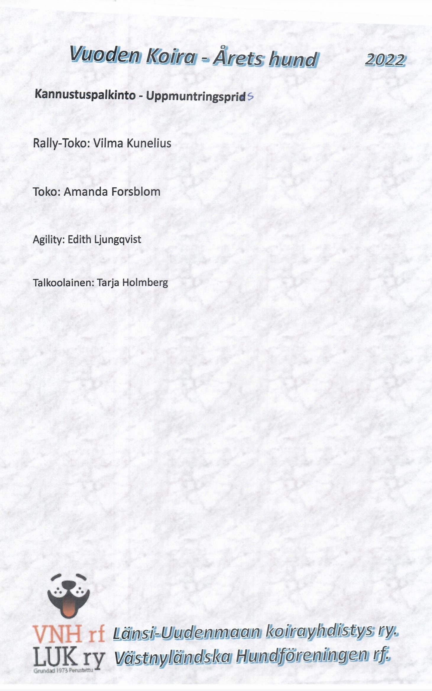 Onnea kaikille osallistujille. Yhdistyksellä on monta uutta kisaavaa koirakkoa ja moni koira keräsi vuoden 2022 aikana erinäisiä titteleitä.