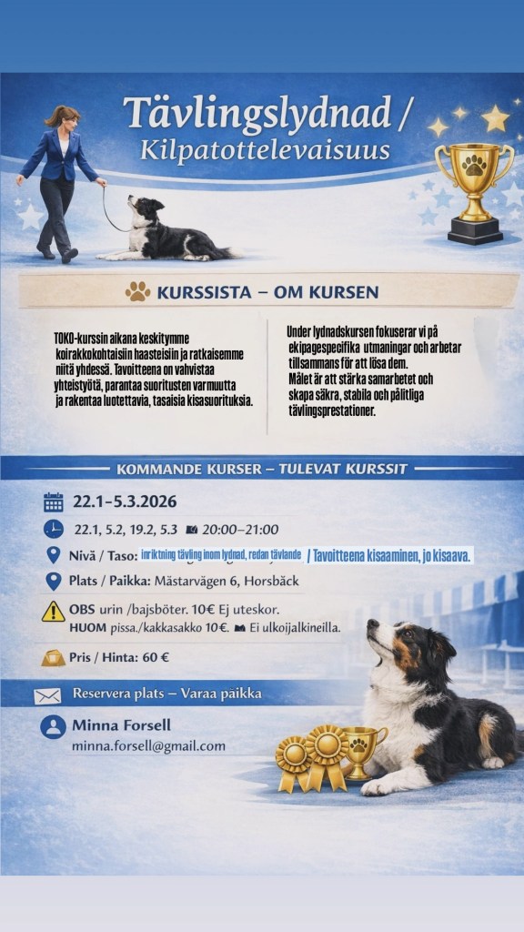 Dela det här: Click to share on X(Avautuu uudessa ikkunassa) X Jaa Facebookissa(Avautuu uudessa ikkunassa) Facebook Tykkää Lataa... Aiheeseen liittyy Tävlingslydnad – TOKO kurssi 4 tammikuun, 2026 / vnhluk