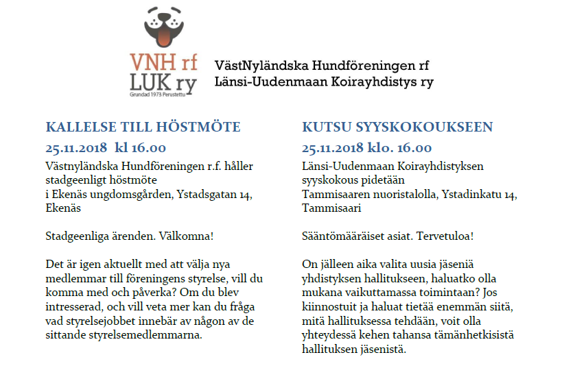 Västnyländska Hundföreningen r.f. håller stadgeenligt vårmöte den